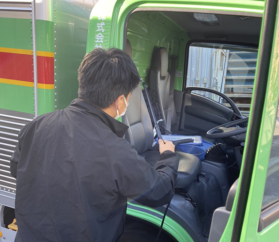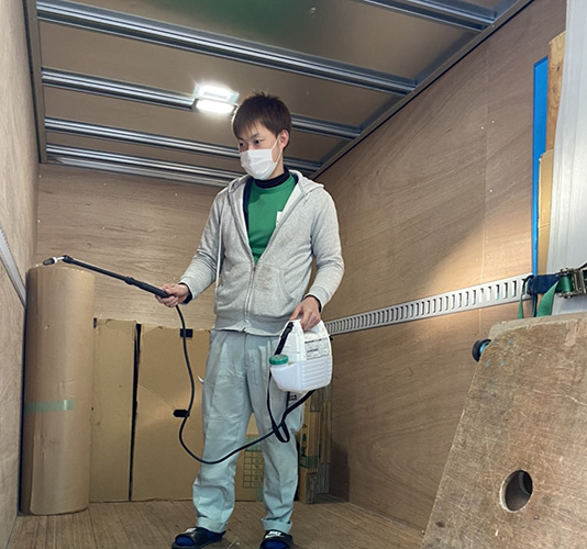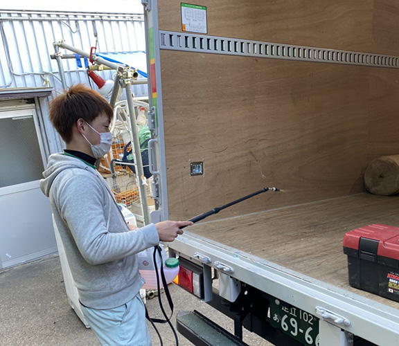 トラックは一度使用するたび、運転席及び荷台をハセッパー水(高濃度次亜塩素酸水)で消毒する。