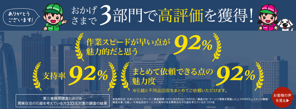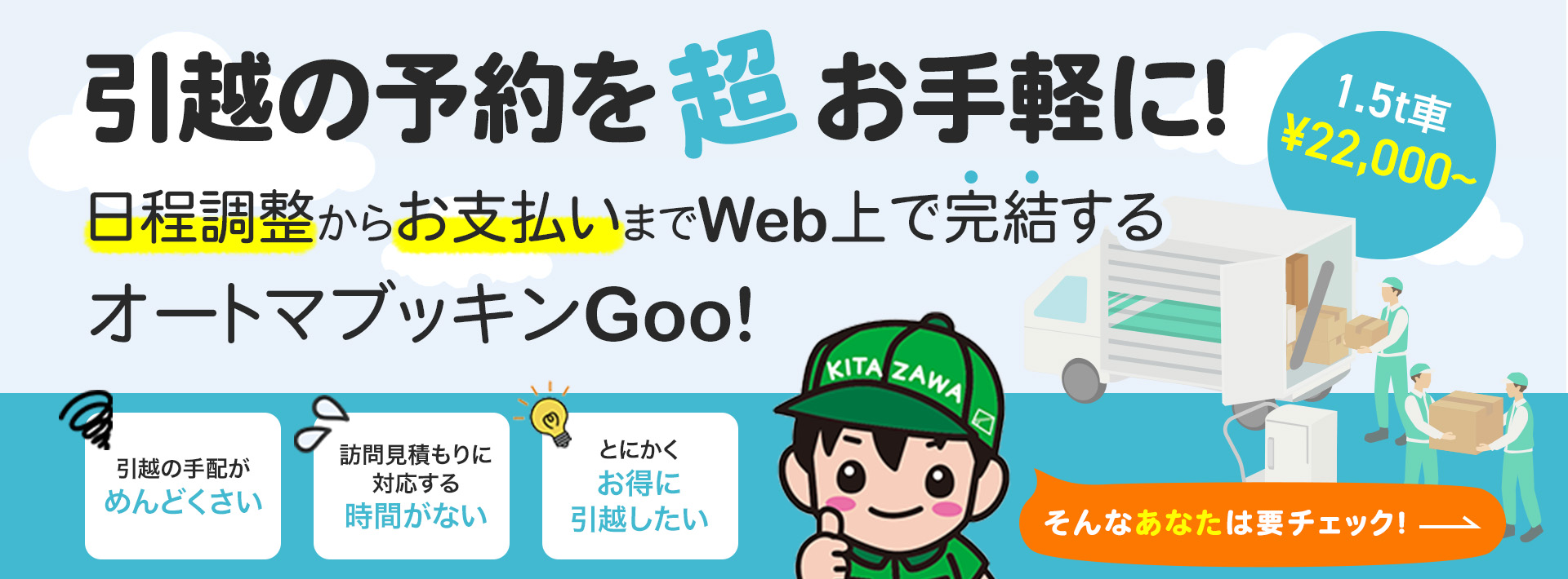 東京エリアを中心としたキタザワ引越センターは、地域密着型の引越しサービスを展開しております。東京23区ならどのような物件の引越しでもお任せください。もちろん、近隣県のお引越しや不用品買取も、キタザワ引越センターは充実したサービスでサポートさせて頂きます。首都圏1300店以上の不動産会社と提携し、予算やご要望に合わせたオーダーメイド感覚の引越しを実現いたします。