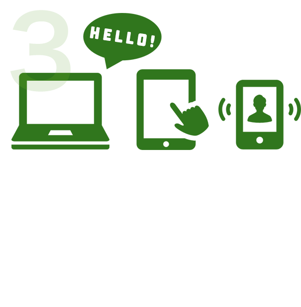 指定のURLからクリックするだけでビデオ・チャットがスタートします。カメラ付きのパソコン、スマートフォン、タブレット端末などから利用できます。