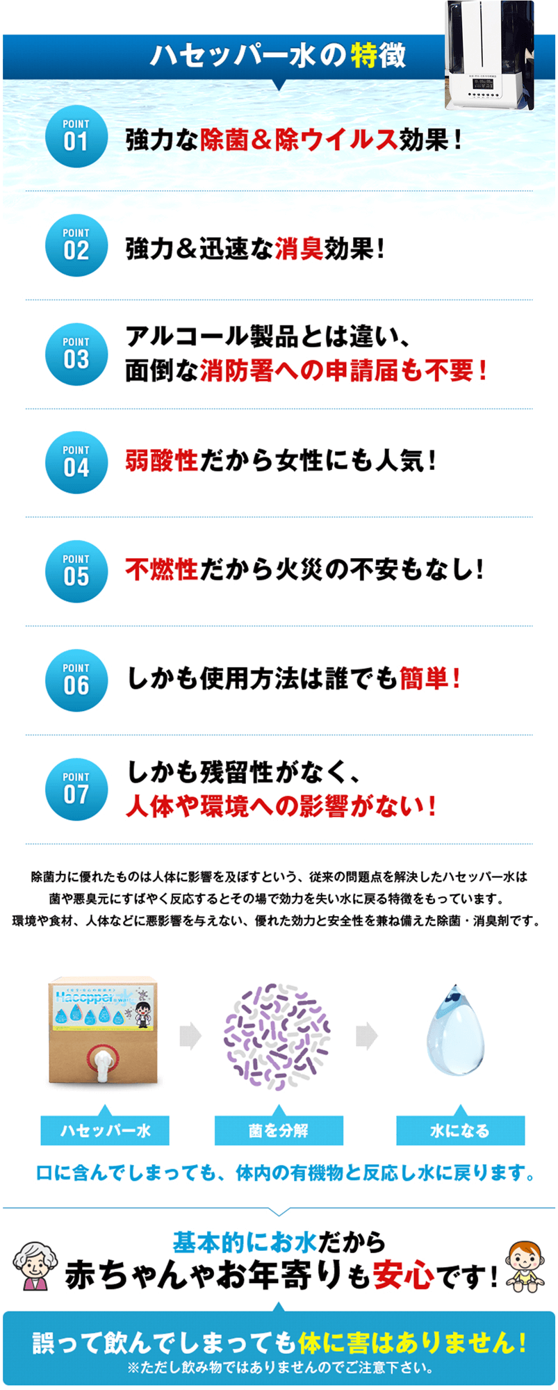 ハセッパー水」は、厳しい衛生基準の食品工場や医療現場で採用されている強力除菌消臭液で、「ハセッパー水生成装置」で生成される次亜塩素酸水を、手軽にご利用出来る様、商品化した除菌消臭液です。