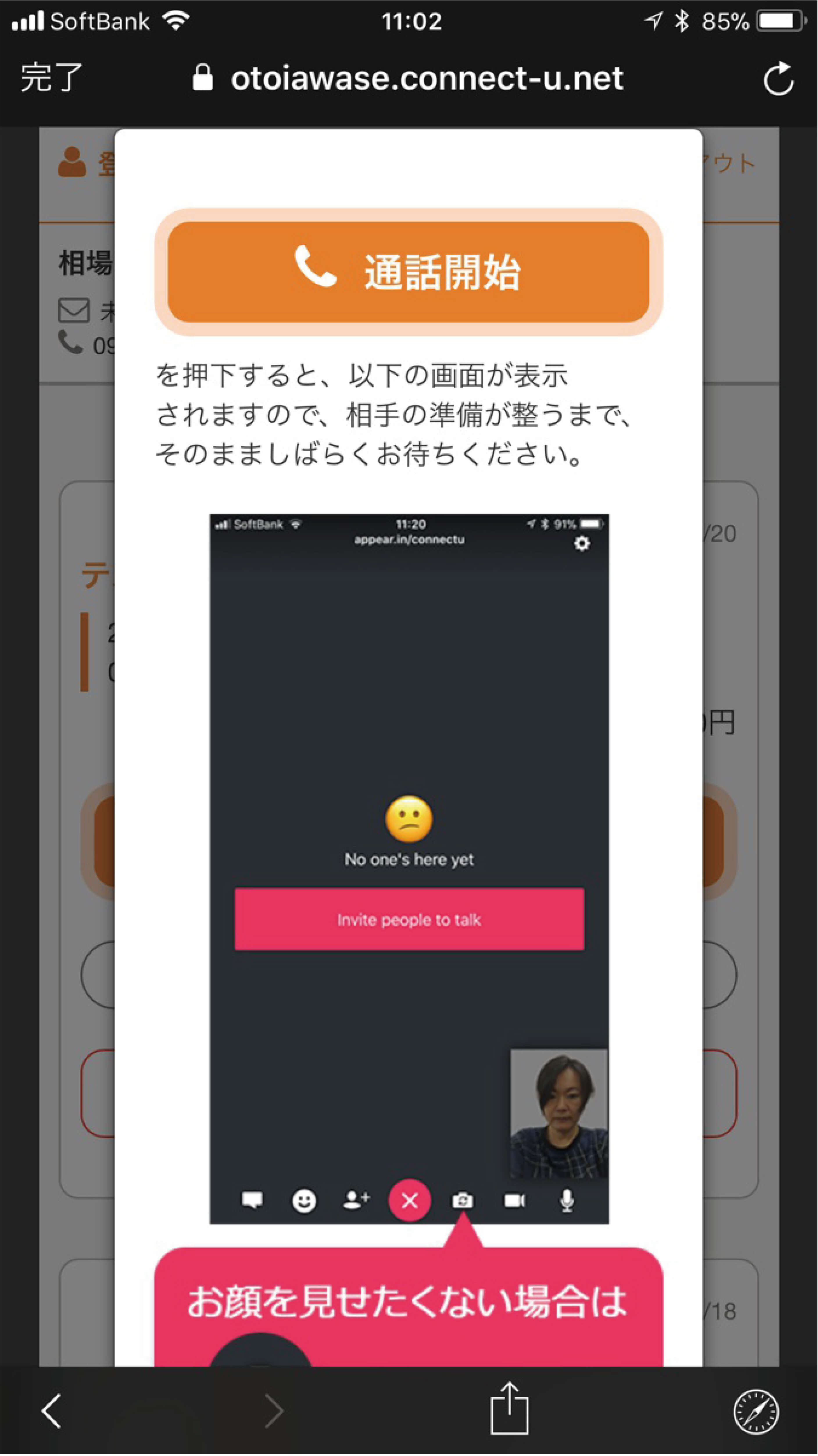 予約時間になりましたら通話開始ボタンをタップしていただき準備が整うまで少々おまちください。