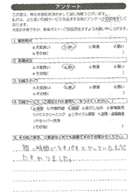 見積もりの電話対応していただいた佐藤様がとても丁寧でした。何社か電話で見積もりしてもらったのですが、佐藤様が一番丁寧で優しく、貴社に決めました。